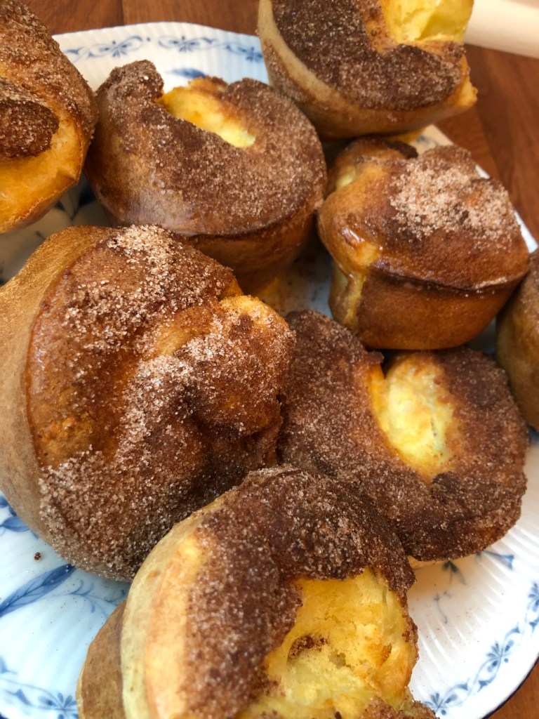 - While popovers are in the oven, mix together sugar and cinnamon. Melt butter into liquid.