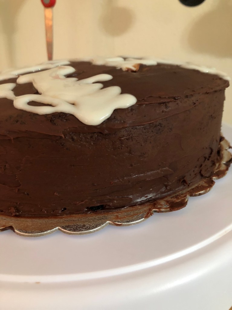 This cake has everything! Two layers of delicious cake with a simple syrup for additional moisture with a ganache frosting and royal icing lettering! This cake was actually a two-day process which sounds daunting but I actually think it makes the whole thing much less stressful. Taking the time to properly chill the cake and the frosting allows for the icing process to be much more stress-free! I really enjoyed icing the cake, something I’m not sure that I’ve ever said before. I used to HATE icing cakes; it was always way more trouble than it was worth. I would get crumbs everywhere and could never get a smooth coating of frosting! Let me tell you that has all changed! Equipped with the right tools and knowledge, I’ve become much more at ease in the icing department. The decorations still need a little bit of work but we can’t all be perfect! To properly ice a cake, you really should use a rotating cake stand. I used to hear this all the time and thought it was a bunch of hooey but it really has some merit. It makes it so much easier to get the sides of the cake without taking off too much frosting. Using offset spatulas also helps a LOT. The funky shape to these spatulas helps to evenly distribute the frosting in an intuitive way. One word of wisdom is that the offset spatula should never actually touch the cake. The spatula is used to move around the frosting which ends up covering the cake for you.