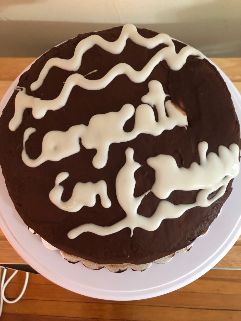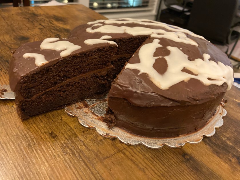This ganache recipe is also one that I have used for a few years but have never taken the time to use all the different bowls and pans that it calls for. Even though it makes way more dishes (which my father never appreciates), this recipe is an easy way to get lovely tempered chocolate frosting for a whole cake. The key to this ganache is the right combination of hot and cold. It’s not as finicky most tempered chocolate recipes but it does need to be warm while being made. The cacao percentage of the chocolate is also very important. The original recipe calls for 62% cacao but I’ve never been able to find that and I use 66% cacao. This is a pretty dark chocolate but doesn’t need much sugar to sweeten it. This recipe won’t really work with a smaller percentage of cacao because the ganache will be too sweet and a little oily. It’s worth the extra couple bucks to get a higher cacao percentage for this recipe. I made this ganache on the morning of the assembly of the cake and put it in the fridge to chill before applying to the cake. One super easy way to soften the ganache if it has chilled is to put in a tablespoon or two of hot water and mix it into the ganache. It helps to soften it without exposing it to the harsh temperature induced by the microwave. Not that I don’t love a good microwave but it doesn’t quite do it for this recipe. I hope that you try this recipe and let me know about your successes or failures in the comments below! Happy baking!
