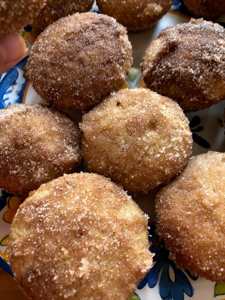 - Once the muffins are done, let sit in the pan for five minutes. Once cool enough to touch, dip in butter then roll in cinnamon sugar. If you’re an enthusiast with the sugar, you may need to make more. If so, use the same amounts as before and store whatever you don’t use as long as it hasn’t touched butter.