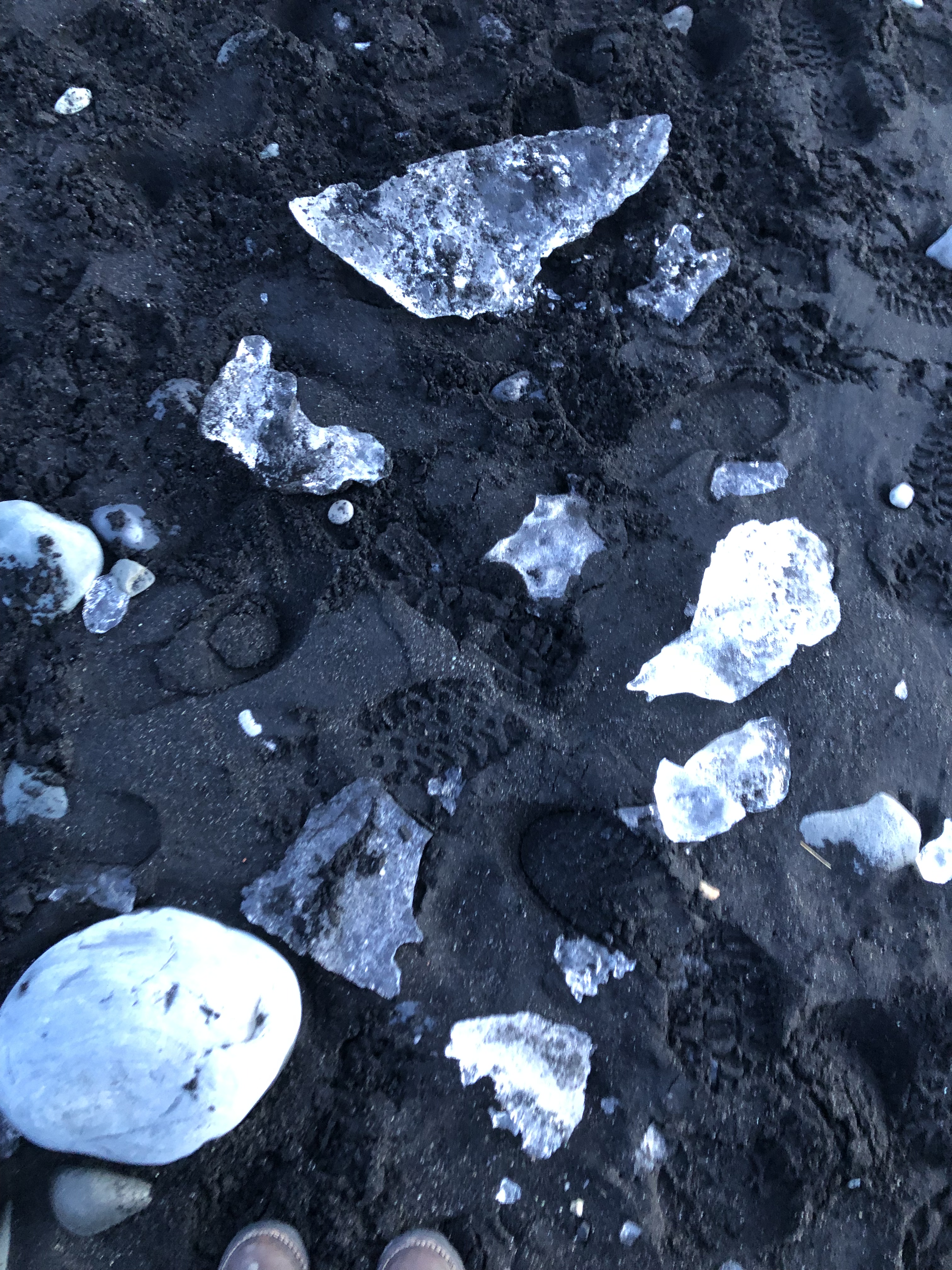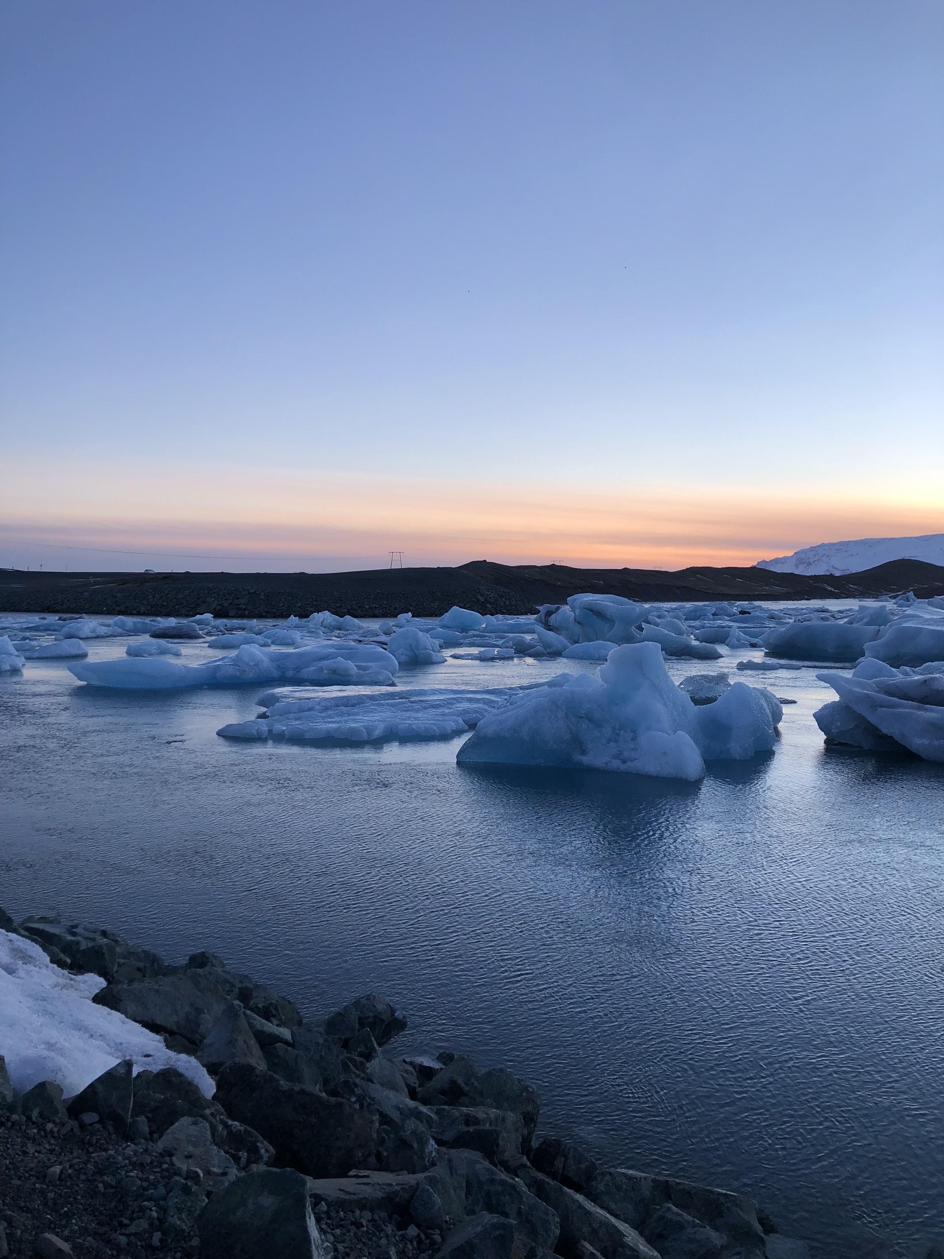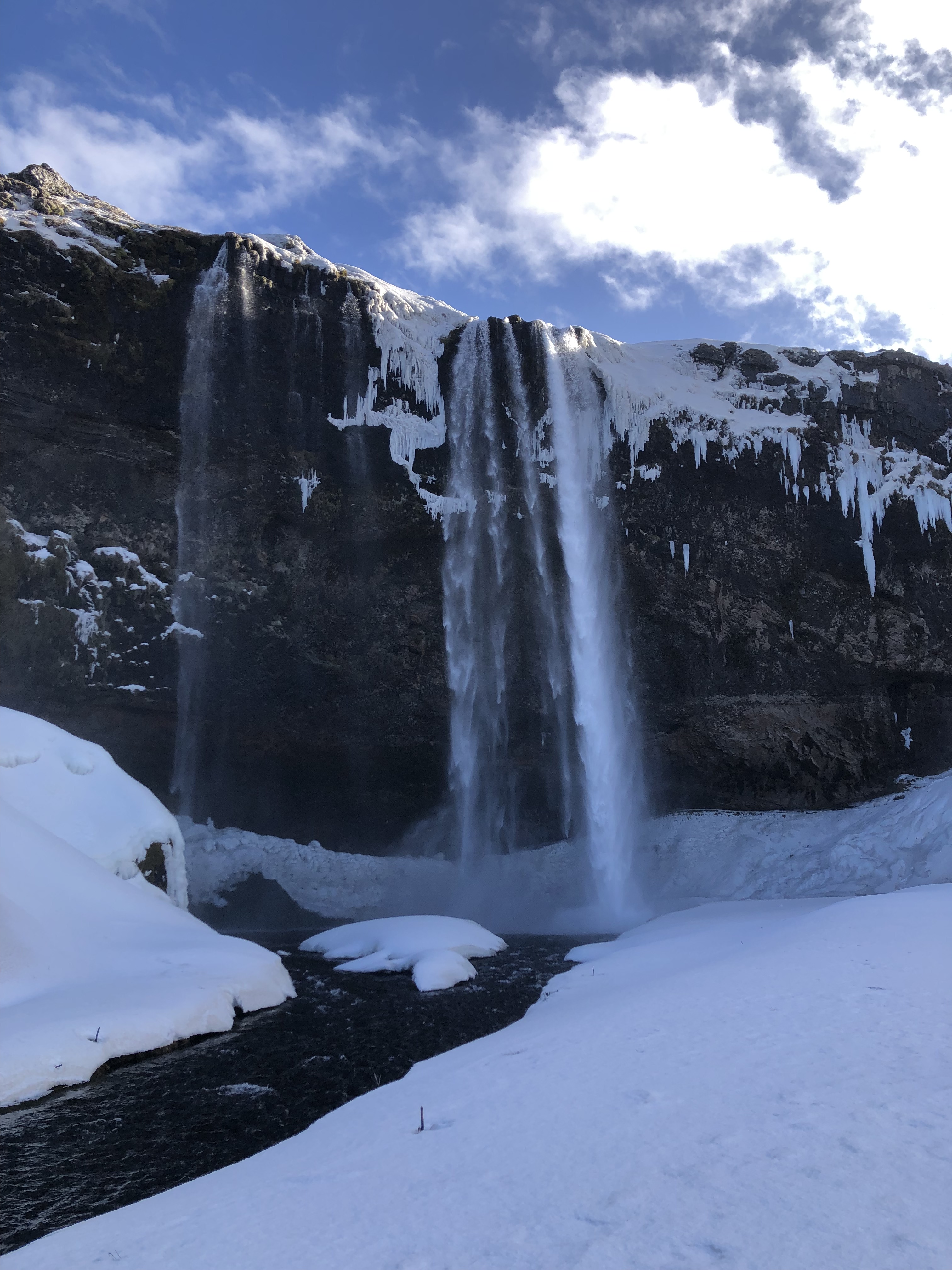 The next day was a bit tricky. We had plans to drive down the south coast to our next place to stay, a little cabin in Vík, but the night before the online road guide was showing all the roads to Vík as closed which was not reassuring. We decided to head out anyway and try driving the Golden Circle which is a ring of tourist sites closer to Reykjavik. However, once we got there, the road was covered in snow and we were able to four wheel drive over it until we got to a section that was backed up because someone else got stuck. We decided to cut our losses, turn around, and head towards Vík and see how far we could go. Surprise, surprise we made it all the way! We stopped for many sites on the way such as Seljalandsfoss, a famous waterfall. It was here where we got to experience the terror that is Icelandic tourist site parking in the winter. The parking lot had more potholes than the whole city of Baltimore and the areas where tourists walked to see the falls were covered in ice. I was happy for my crampons, but it was still a rather precarious experience. The sites are all cool but it’s not cool to have to risk life and limb to get to see them. Perhaps this is where we should have learned our lesson about visiting Iceland in the winter months. We also decided to go further than initially planned because the weather for the next day was looking really rough. We ended up seeing every single site on our itinerary but had to make some significant adjustments to make that happen. We drove all the way to Jökulsárlón, the glacier lagoon which was wayyy further than we had planned on driving that day. From the Golden Circle spot where we turned around to there was a five-hour drive which we had not planned on. However, we made a last-minute change and were able to go see it! We saw both the glacier lagoon and the diamond beach right before the sun set which was magical. From there, we had a long drive back to Vík on the dark and somewhat twisty Icelandic roads but thanks to my superior driving skills, we made it back in one piece!